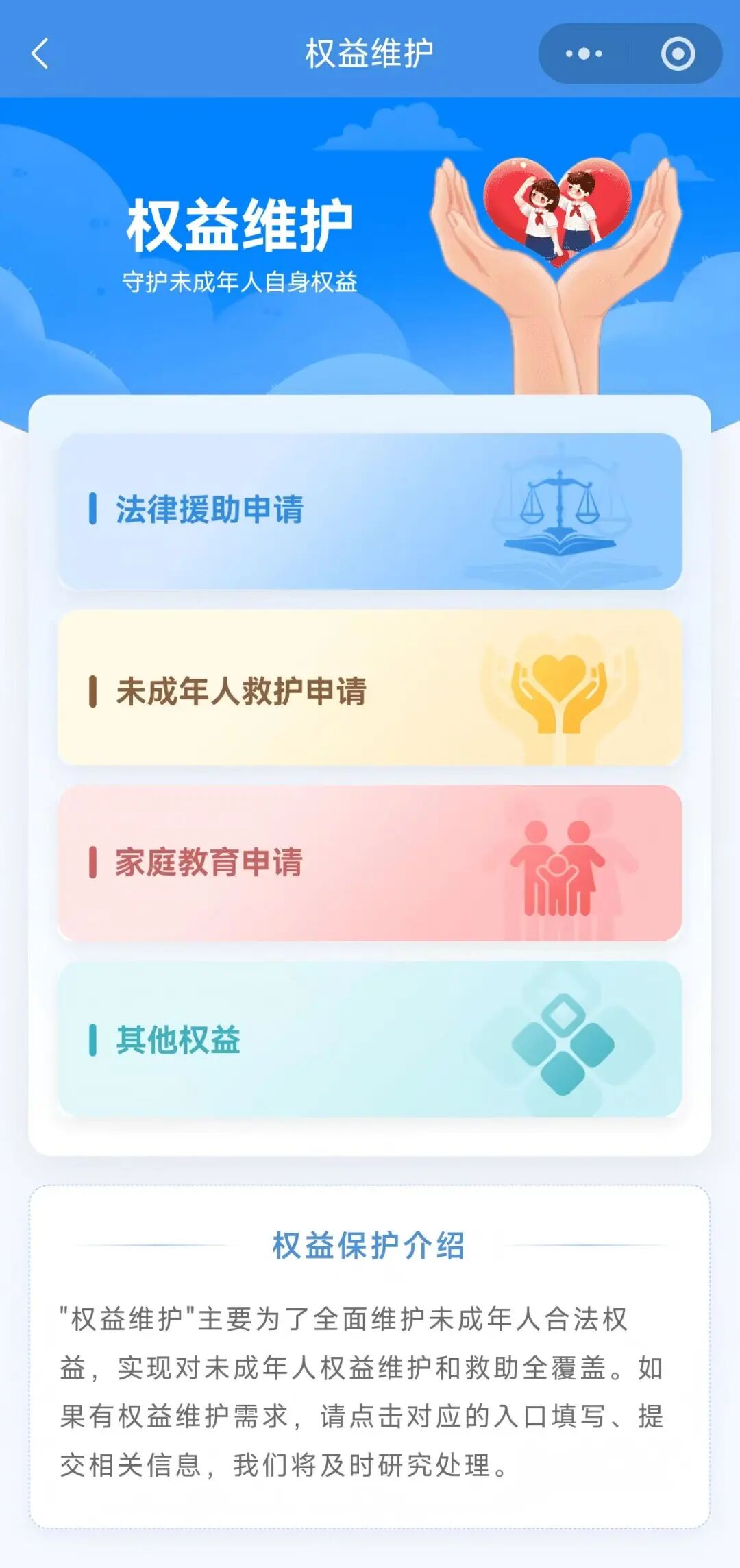 权益互动模块,开通法律援助申请、在线咨询求助及活动报名渠道,打通未成年人权益保障便捷渠道,实现“零距离”保护。
