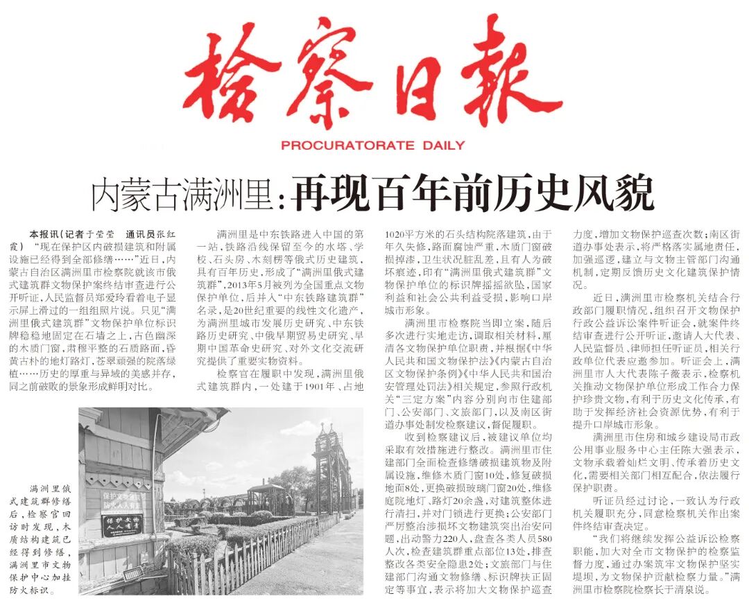 “现在保护区内破损建筑和附属设施已经得到全部修缮……”近日,内蒙古自治区满洲里市检察院就该市俄式建筑群文物保护案终结审查进行公开听证,人民监督员郑爱玲看着电子显示屏上滑过的一组组照片说。只见“满洲里俄式建筑群”文物保护单位标识牌稳稳地固定在石墙之上,古色幽深的木质门窗,肃穆平整的石质路面,昏黄古朴的地灯路灯,苍翠顽强的院落绿植……历史的厚重与异域的美感并存,同之前破败的景象形成鲜明对比。