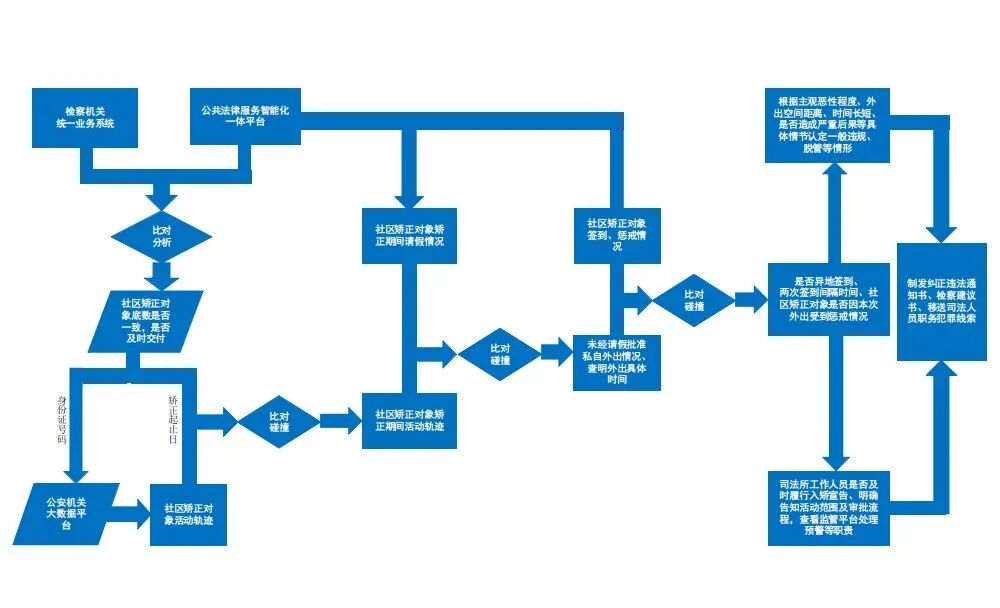 该模型通过内蒙古公共法律服务智能化一体平台、检察业务应用系统与公安机关大数据平台系统进行数据比对分析,获取社区矫正对象行动轨迹。将行动轨迹与请假情况进行数据比对碰撞,得出社区矫正对象未经请假审批私自外出的情况和具体外出时间。再与社区矫正对象签到、惩戒情况进行数据比对碰撞,筛查出是否存在异地签到、两次签到间隔时间、社区矫正对象是否因本次违规外出受到惩戒等情况,最终通过分析判断作出处理决定。该模型的研用不仅纠正了一些社区矫正对象利用手机监管软件签到间隙违规外出返回后再次签到,有意制造未曾外出的假象来逃避监管的情况,还纠正了一批社区矫正对象违规外出后在异地签到,司法所工作人员未及时发现并处置的情况。