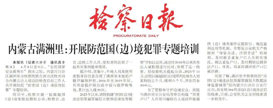 另据了解,满洲里市检察院的“涉国(边)境违法犯罪漏罪漏犯大数据法律监督模型”经内蒙古自治区公安厅应用,共发现384件涉国(边)境违法犯罪线索,目前,公安机关正在对线索进一步核查中。