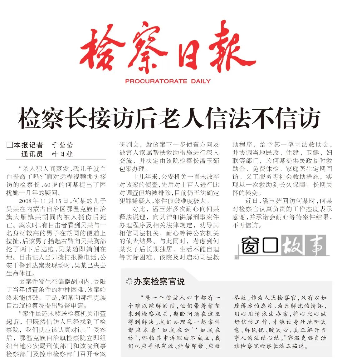“每一个信访人心中都有一个难以疏解的结,他们带着希望来到检察机关,期盼问题在这里得到解决。我们办理每一起案件都应本着‘如我在诉’‘如我在访’,哪怕其申诉理由不成立,我们也应寻根究源、能帮即帮、应救尽救。作为人民检察官,只有以如履薄冰的态度、为民解忧的情怀,用心用情依法办案,将心比心做好信访工作,才能设身处地听民意、解民忧、暖民心,真正解开当事人的法结心结。”鄂温克族自治旗检察院检察长潘玉茹说。
