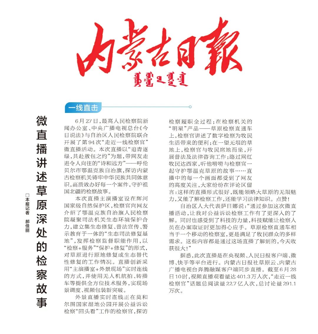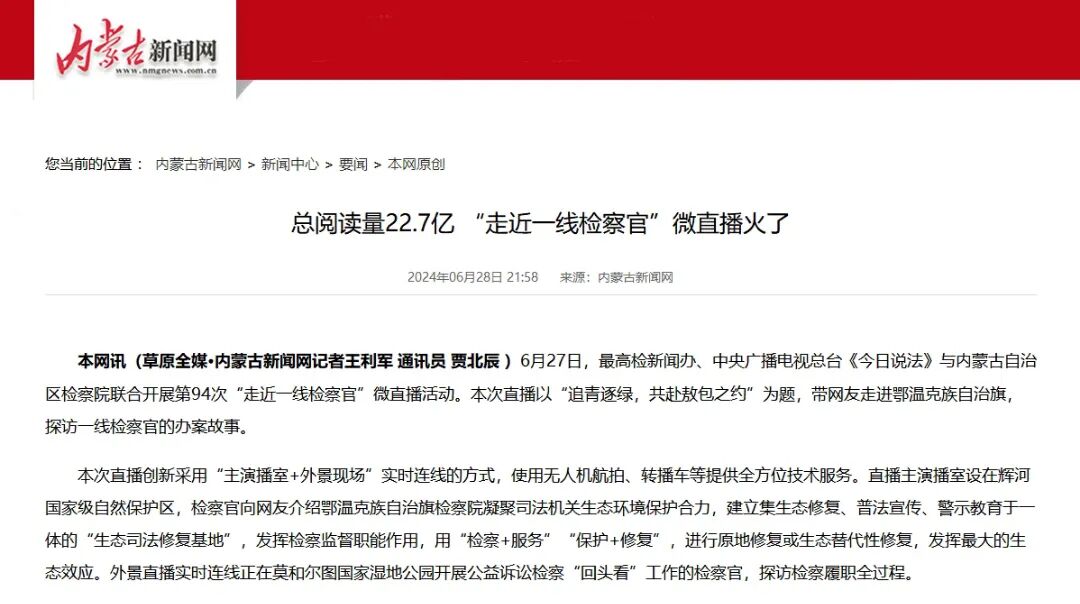 6月27日,最高人民检察院新闻办公室、中央广播电视总台《今日说法》与自治区检察院联合开展了第94次“走近一线检察官”微直播活动。中国网、内蒙古日报、内蒙古新闻网、草原云等多家中央、自治区级主流媒体关注和报道。