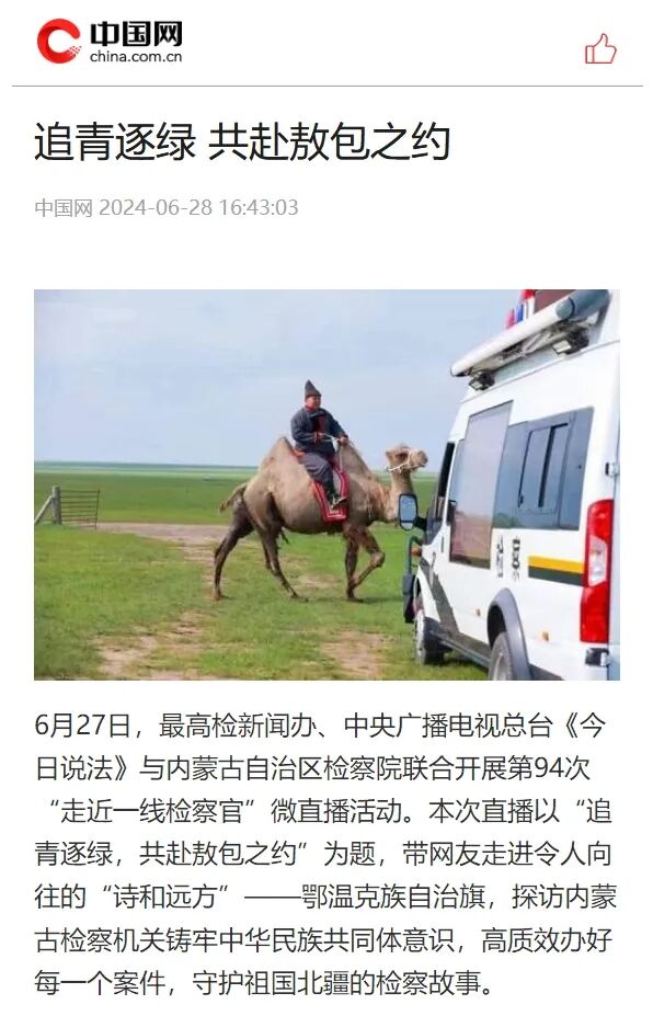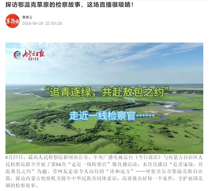 6月27日,最高人民检察院新闻办公室、中央广播电视总台《今日说法》与自治区人民检察院联合开展了第94次“走近一线检察官”微直播活动。本次直播以“追青逐绿,共赴敖包之约”为题,带网友走进令人向往的“诗和远方”——呼伦贝尔市鄂温克族自治旗,探访内蒙古检察机关铸牢中华民族共同体意识,高质效办好每一个案件,守护祖国北疆的检察故事。