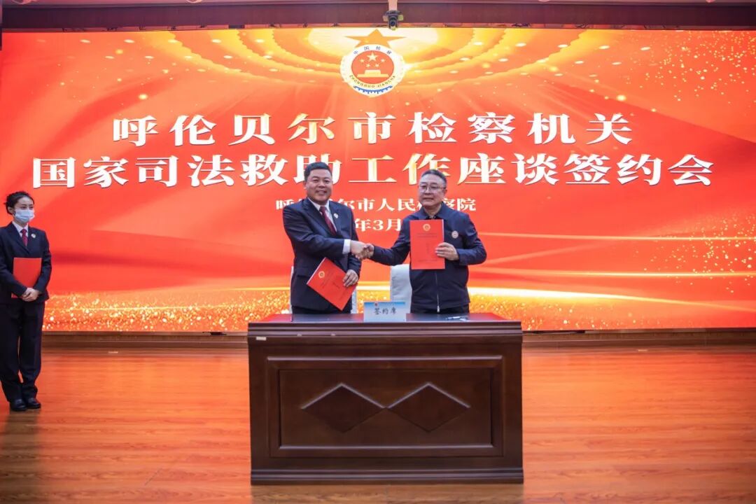 2023年3月17日,呼伦贝尔市检察院邀请呼伦贝尔市红十字会、工商联、民政局、教育局、妇女联合会、乡村振兴局、残联、精神卫生中心、退役军人事务局等11家单位,就加强国家司法救助与社会救助协调联动以及线索移送、多元救助、综合帮扶等内容进行交流座谈。会上,4家爱心企业当场签署《参与呼伦贝尔市检察机关国家司法救助工作意向书》,共同为打造司法救助资金池贡献力量;呼伦贝尔市检察院与红十字会共同签署《呼伦贝尔市检察机关国家司法救助专项基金监管协议》,进一步规范资金的监管使用。同时,为保障国家司法救助工作顺利进行,呼伦贝尔市检察院控告申诉检察部门与计划财务装备局合力提高救助金发放效率,严格把好发放关,并主动接受督察审计,确保专款专用。同年4月3日,呼伦贝尔市检察院与教育、民政、工商联、红十字会等部门联合印发《关于建立国家司法救助与社会救助衔接机制的实施意见(试行)》,进一步打造呼伦贝尔市检察机关国家司法救助共同体新格局。