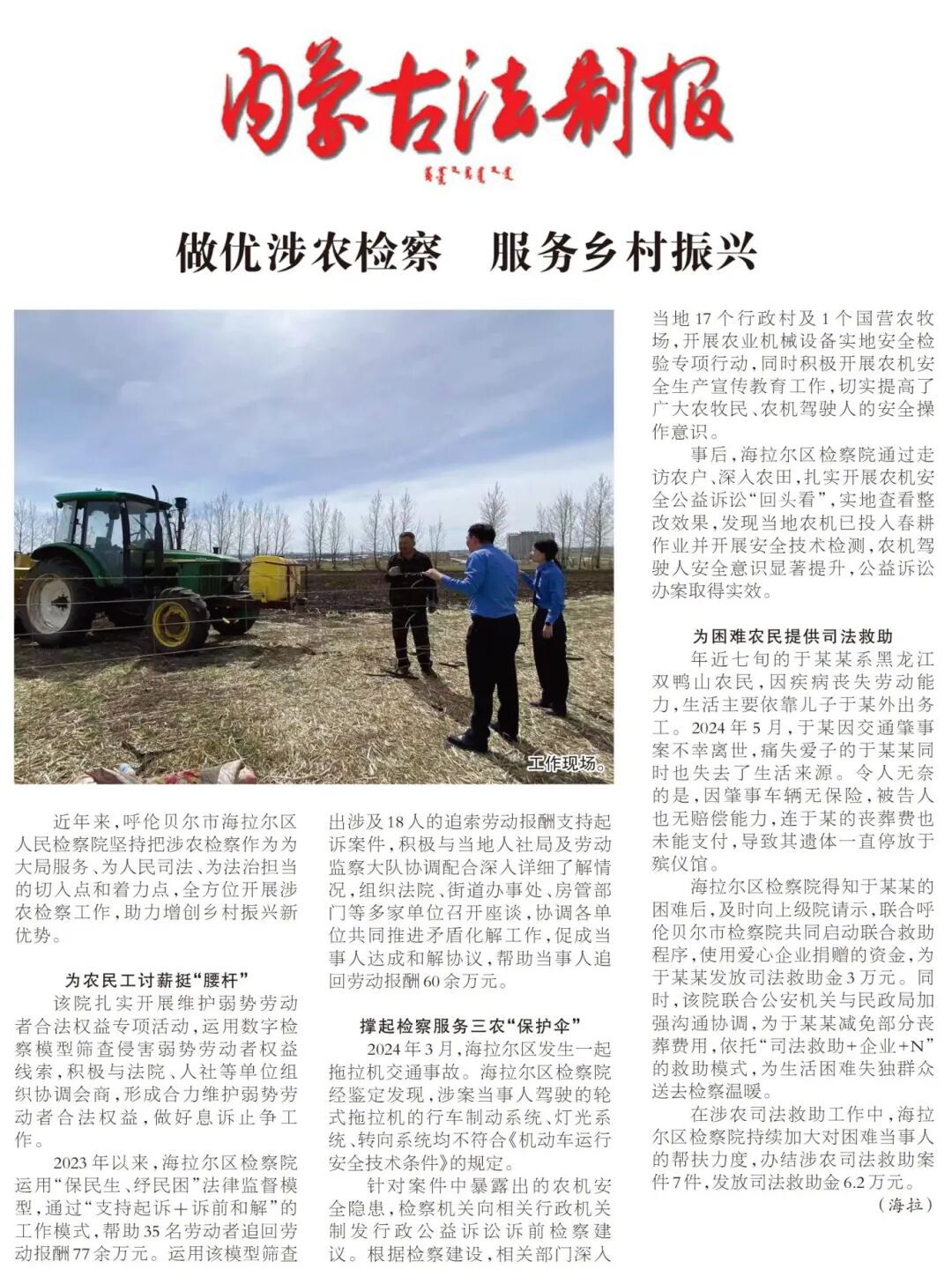 近年来,呼伦贝尔市海拉尔区检察院坚持把涉农检察作为为大局服务、为人民司法、为法治担当的切入点和着力点,全方位开展涉农检察工作,助力增创乡村振兴新优势。