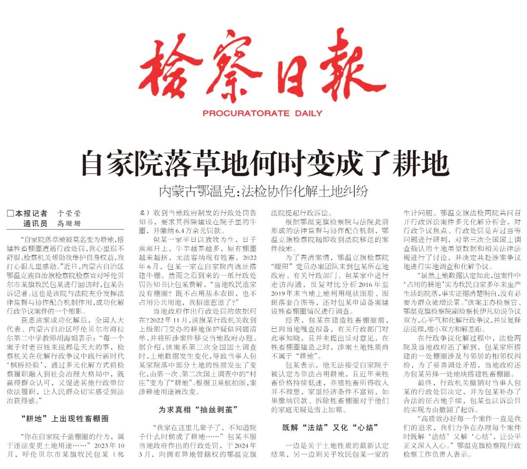 “自家院落草地被莫名变为耕地,搭建牲畜棚圈遭遇行政处罚,我心里很不舒服。检察机关帮助我维护自身权益,我打心眼儿里感动。”近日,内蒙古自治区鄂温克族自治旗检察院检察官对呼伦贝尔市某旗牧民包某进行回访时,包某告诉记者。这也是该院与法院充分发挥法律监督与协作配合机制作用,成功化解行政争议案件的一个缩影。
