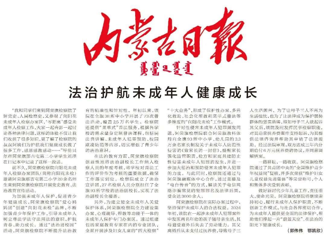 阿荣旗检察院在实际办案过程中,坚持保护未成年人的合法权益。2024年初,该院在一起涉未成年人犯罪案件中发现两名年幼的孩子随母亲生活,其母遭受意外后失去了劳动能力。其父离婚后从未支付过抚养费,导致母子三人生活困苦。为了让母子三人不再为生活担忧,也为了让法律成为保护弱势群体的坚实盾牌,得知母子三人欲起诉其父后,该院及时发挥民事检察职能,对其追索抚养费案件支持起诉,为其提供法律咨询并帮助其申请了法律援助。经过法院审理,双方达成三年内分期给付6万元抚养费的协议,并同意调解结案。
