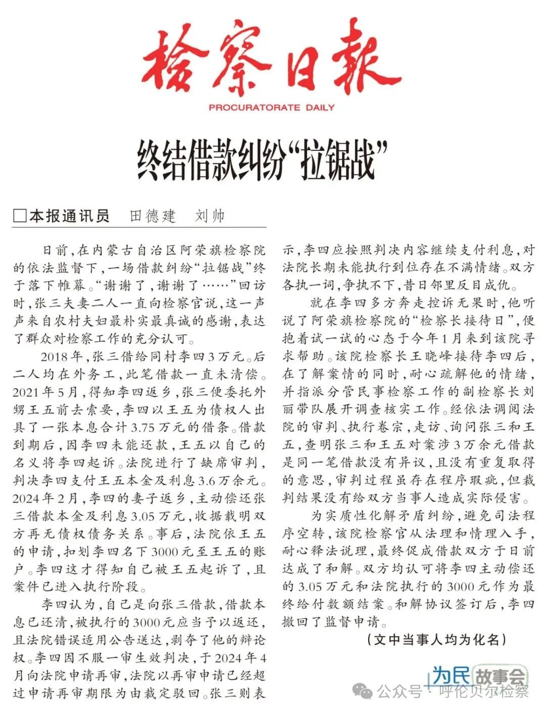 日前,在内蒙古自治区阿荣旗检察院的依法监督下,一场借款纠纷“拉锯战”终于落下帷幕。“谢谢了,谢谢了……”回访时,张三夫妻二人一直向检察官说,这一声声来自农村夫妇最朴实最真诚的感谢,表达了群众对检察工作的充分认可。