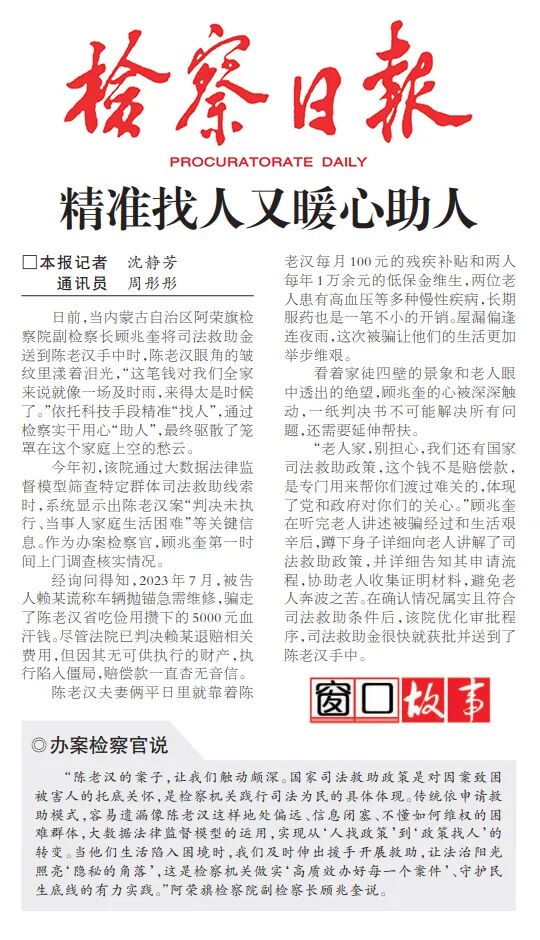 “陈老汉的案子,让我们触动颇深。国家司法救助政策是对因案致困被害人的托底关怀,是检察机关践行司法为民的具体体现。传统依申请救助模式,容易遗漏像陈老汉这样地处偏远、信息闭塞、不懂如何维权的困难群体,大数据法律监督模型的运用,实现从‘人找政策’到‘政策找人’的转变。当他们生活陷入困境时,我们及时伸出援手开展救助,让法治阳光照亮‘隐秘的角落’,这是检察机关做实‘高质效办好每一个案件’、守护民生底线的有力实践。”阿荣旗检察院副检察长顾兆奎说。