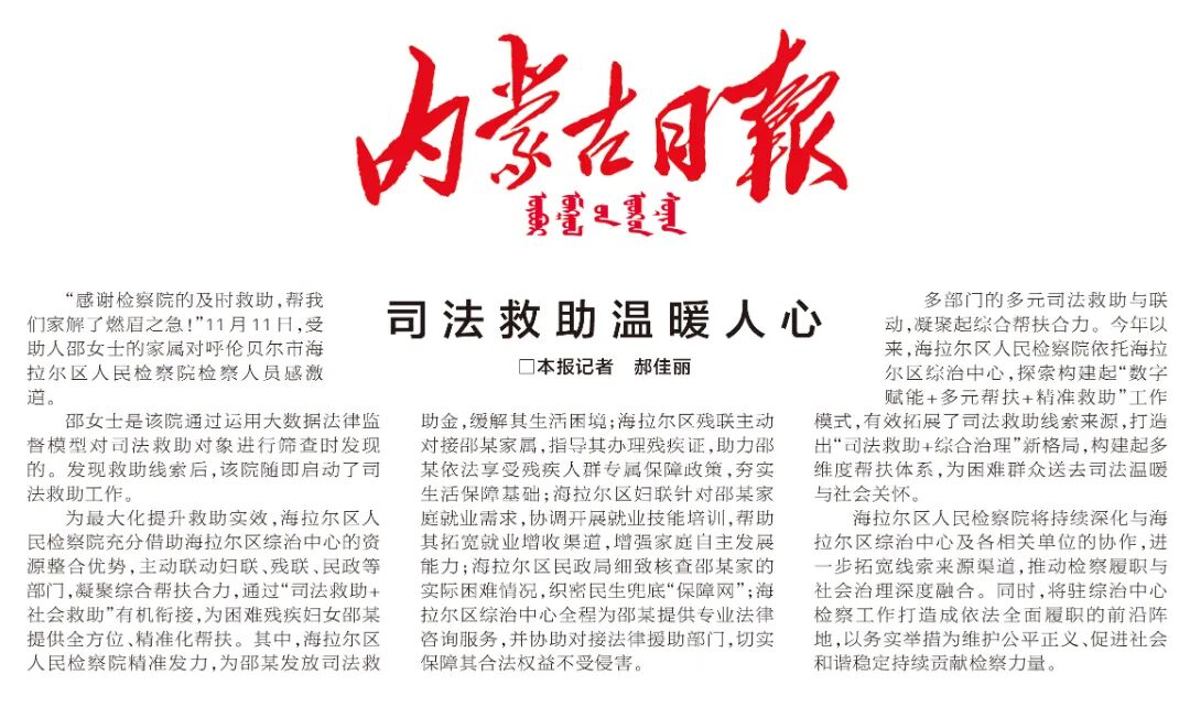 多部门的多元司法救助与联动,凝聚起综合帮扶合力。今年以来,海拉尔区检察院依托海拉尔区综治中心,探索构建起“数字赋能+多元帮扶+精准救助”工作模式,有效拓展了司法救助线索来源,打造出“司法救助+综合治理”新格局,构建起多维度帮扶体系,为困难群众送去司法温暖与社会关怀。
