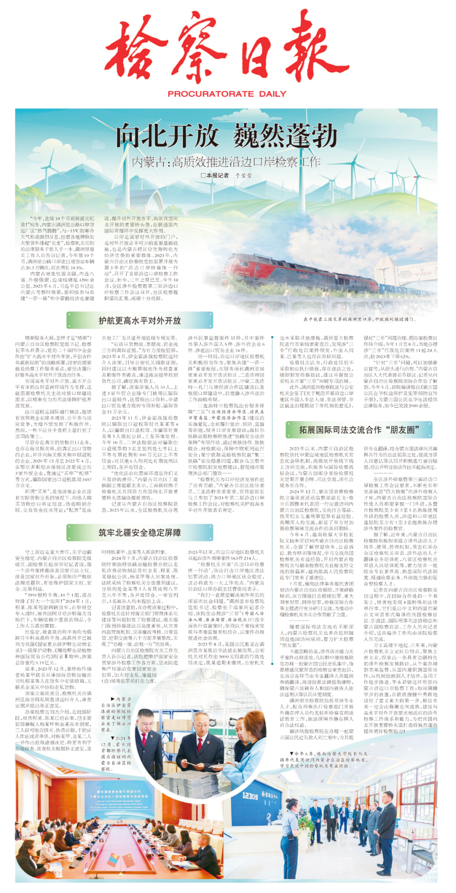 二连浩特市检察院出台服务保障“三区”(边境经济合作区、边民互市贸易区、中蒙经济合作区)建设的实施意见,全面履行惩治、预防、监督等职能,服务口岸发展建设;海拉尔铁路运输检察院推进“铁路安全法治保障”专项行动,通过地铁协作、铁铁联合、府检联动,保障中欧班列运行安全;集宁铁路运输检察院就“集二铁路”安全隐患问题,联合乌兰察布市检察院制发检察建议,督促城市管理执法部门整改……
