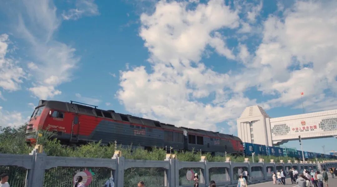 在中俄蒙三国交界的满洲里口岸,中欧班列驶过国门。