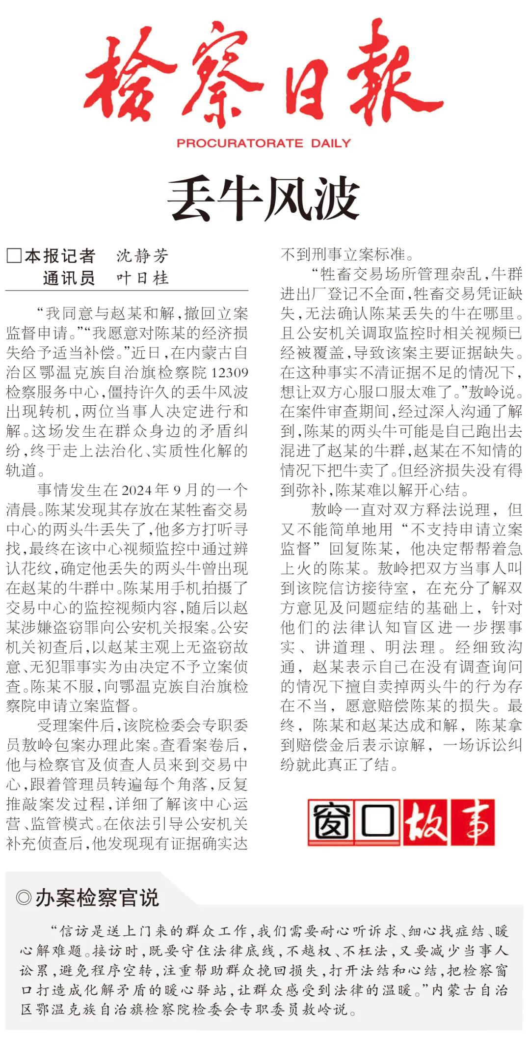 “我同意与赵某和解,撤回立案监督申请。”“我愿意对陈某的经济损失给予适当补偿。”近日,在内蒙古自治区鄂温克旗检察院12309检察服务中心,僵持许久的丢牛风波出现转机,两位当事人决定进行和解。这场发生在群众身边的矛盾纠纷,终于走上法治化、实质性化解的轨道。