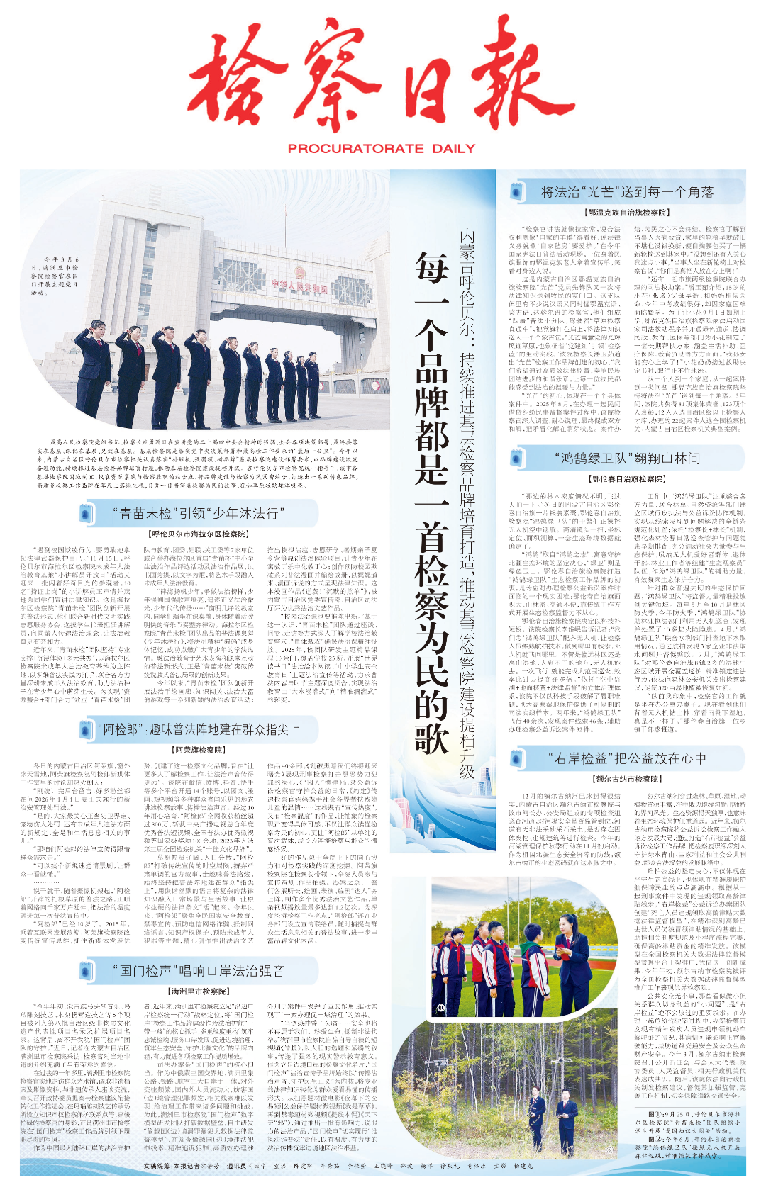最高人民检察院党组书记、检察长应勇近日在宣讲党的二十届四中全会精神时强调,全会各项决策部署,最终要落实在基层、深化在基层、见效在基层。基层检察院是落实党中央决策部署和最高检工作要求的“最后一公里”。今年以来,内蒙古自治区呼伦贝尔市检察机关认真落实“补短板、强弱项、树品牌”基层检察院建设部署要求,以品牌建设激发奋进动能,持续推进基层检察品牌培育打造,推动基层检察院建设提档升级。在呼伦贝尔市检察院统一指导下,该市各基层检察院因地制宜,找准资源禀赋与检察履职的结合点,将品牌建设与检察为民紧密结合,打造出一系列特色品牌。高质量检察工作品牌在草原上落地生根,日复一日书写着检察为民的故事,犹如草原牧歌雄浑嘹亮。