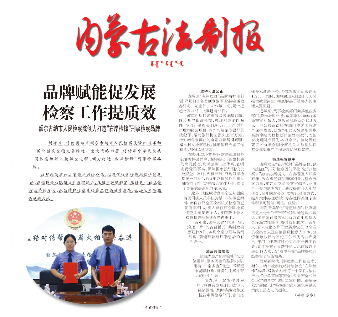 近年来,额尔古纳市检察院紧扣筑牢祖国北疆安全稳定屏障这一重大战略部署,将铸牢中华民族共同体意识融入履职全过程,倾力打造“右岸检锋”刑事检察品牌。