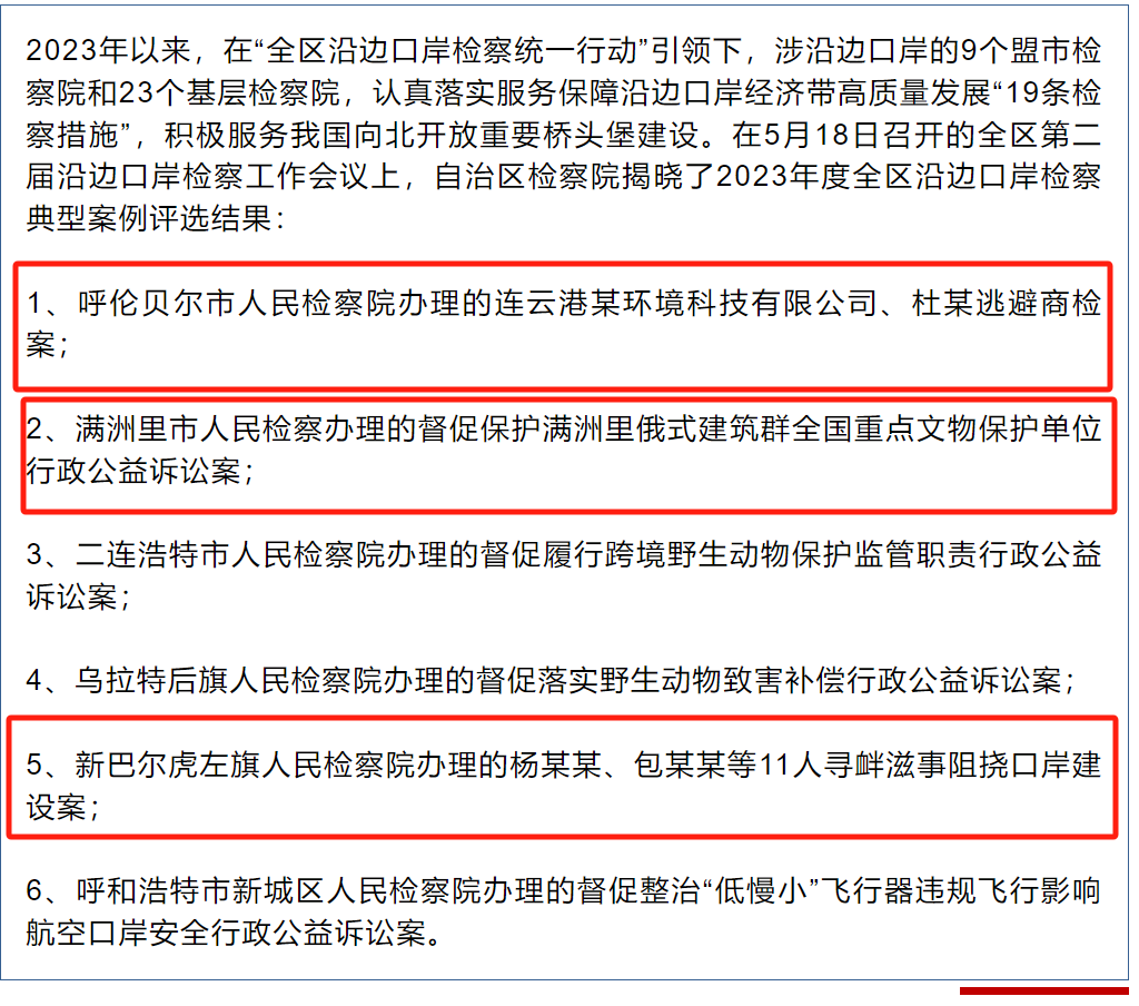 近日,内蒙古自治区检察院在全区第二届沿边口岸检察工作会议上揭晓了 2023年度全区沿边口岸检察典型案例,共评选出典型案例6件,呼伦贝尔市检察机关办理的3件案例上榜,分别是由呼伦贝尔市检察院办理的连云港某环境科技有限公司、杜某逃避商检案,满洲里市检察院办理的督促保护满洲里俄式建筑群全国重点文物保护单位行政公益诉讼案,新巴尔虎左旗检察院办理的杨某某、包某某等11人寻衅滋事阻挠口岸建设案。