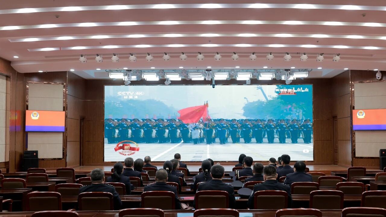 座谈会后,全体司法警察身着制服、精神抖擞,整齐端坐注视屏幕,重温九三阅兵盛典,感悟强军力量,凝聚忠诚履职的奋进动力。此次重温观看阅兵不仅是一次视觉的震撼,更是一次深刻的思想洗礼,从受阅官兵身上看到的忠诚与担当,正是司法警察队伍需要传承和践行的精神内核。大家一致表示,将把阅兵精神转化为工作动力,以更加昂扬的斗志、更加务实的作风,投身到各项警务保障当中,为检察事业高质量发展保驾护航。