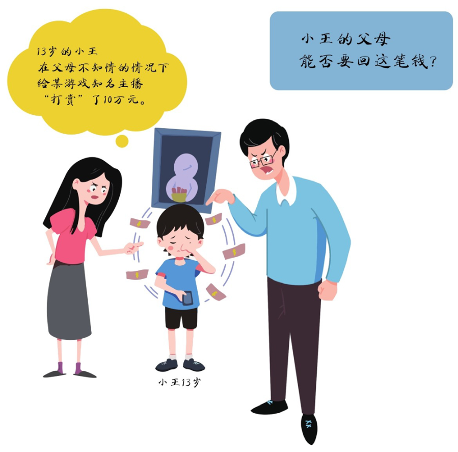 具体到本示例,“打赏”的法律性质是一种赠与行为,小王的父母能否要回这笔钱的关键在于小王能否独立实施“打赏”行为,即该“打赏”行为是否与小王的年龄、智力相适应。对此,我们认为,由于小王打赏知名主播10万元,数额较大,与小王的年龄、智力不相适应,故小王无法独立实施该“打赏”行为。依据《民法典》第145条规定,在小王的父母不同意或不追认的情形下,该“打赏”行为无效,小王的父母可以要求平台退回该笔款项。相反,如果小王“打赏”的金额很小或者小王的父母事先表示同意或事后表示追认,那么该“打赏”行为就是有效的,打赏给主播的钱就不能要求返还。